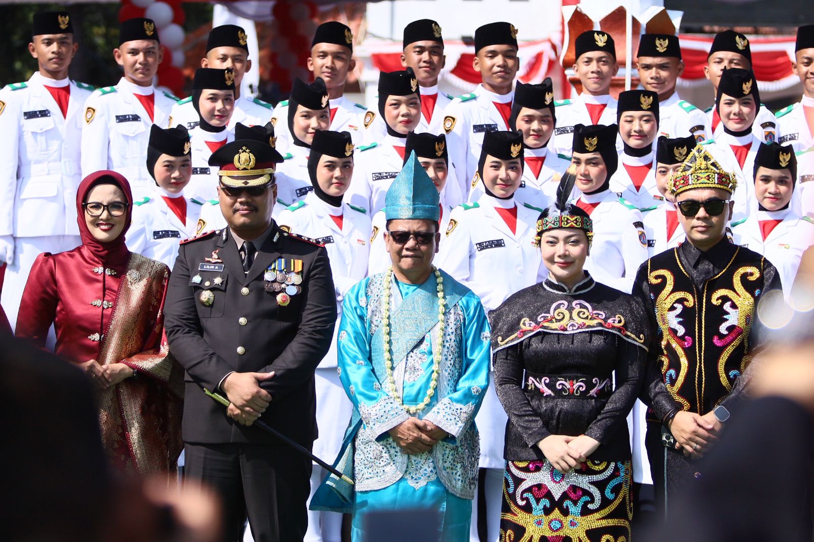 Tampak hadir di barisan utama, Kapolres Brebes, AKBP Lilik Ardiansyah, bersama sang istri yang juga menjabat sebagai Ketua Bhayangkari Cabang Brebes. Tidak hanya itu, seluruh jajaran Pejabat Utama (PJU) Polres dan pengurus Bhayangkari juga turut serta dalam upacara tersebut. Kehadiran mereka secara lengkap ini menunjukkan sinergi kuat antara institusi Polri dan organisasi pendukungnya dalam menyemarakkan hari kemerdekaan.