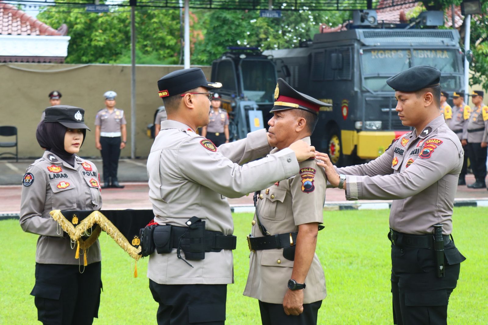 Setelah pelantikan jabatan, suasana haru sekaligus bangga menyelimuti lapangan saat 59 personel dari berbagai jenjang kepangkatan melaksanakan laporan resmi kenaikan pangkat. Kapolres Brebes secara simbolis melepas pangkat lama dan memasangkan pangkat baru kepada perwakilan anggota.
