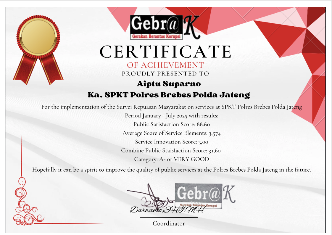 Atas capaian tersebut, sebuah penghargaan Certificate of Achievement diberikan oleh Lembaga Gebr@K (Gerakan Berantas Korupsi) kepada Aiptu Suparno selaku Ka. SPKT Polres Brebes. Penghargaan ini merupakan bentuk apresiasi atas dedikasi dalam mengimplementasikan standar pelayanan yang transparan dan akuntabel.